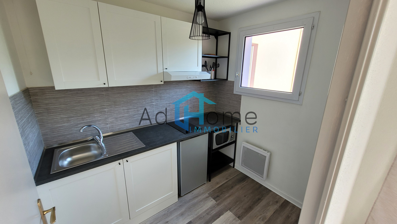 Situé au 1er étage, l'appartement est constitué d'une entrée avec un placard aménagé. Une pièce de vie aménagée avec une partie séjour/salon et un coin nuit. Vous profiterez d'une cuisine séparée aménagée de meubles hauts et bas avec plaque de cuisson, hotte aspirante et micro-onde. Une salle de bains comprenant une baignoire avec vasque et meuble sous vasque. Un wc séparé