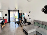 Le rez-de-chaussée se compose d'une entrée desservant une pièce de vie lumineuse et traversante avec une cuisine ouverte, aménagée et équipée, un cellier et un garage attenants, ainsi que des WC séparés. Depuis la pièce de vie, vous aurez également accès à une grande terrasse entièrement carrelée et à son jardin.
