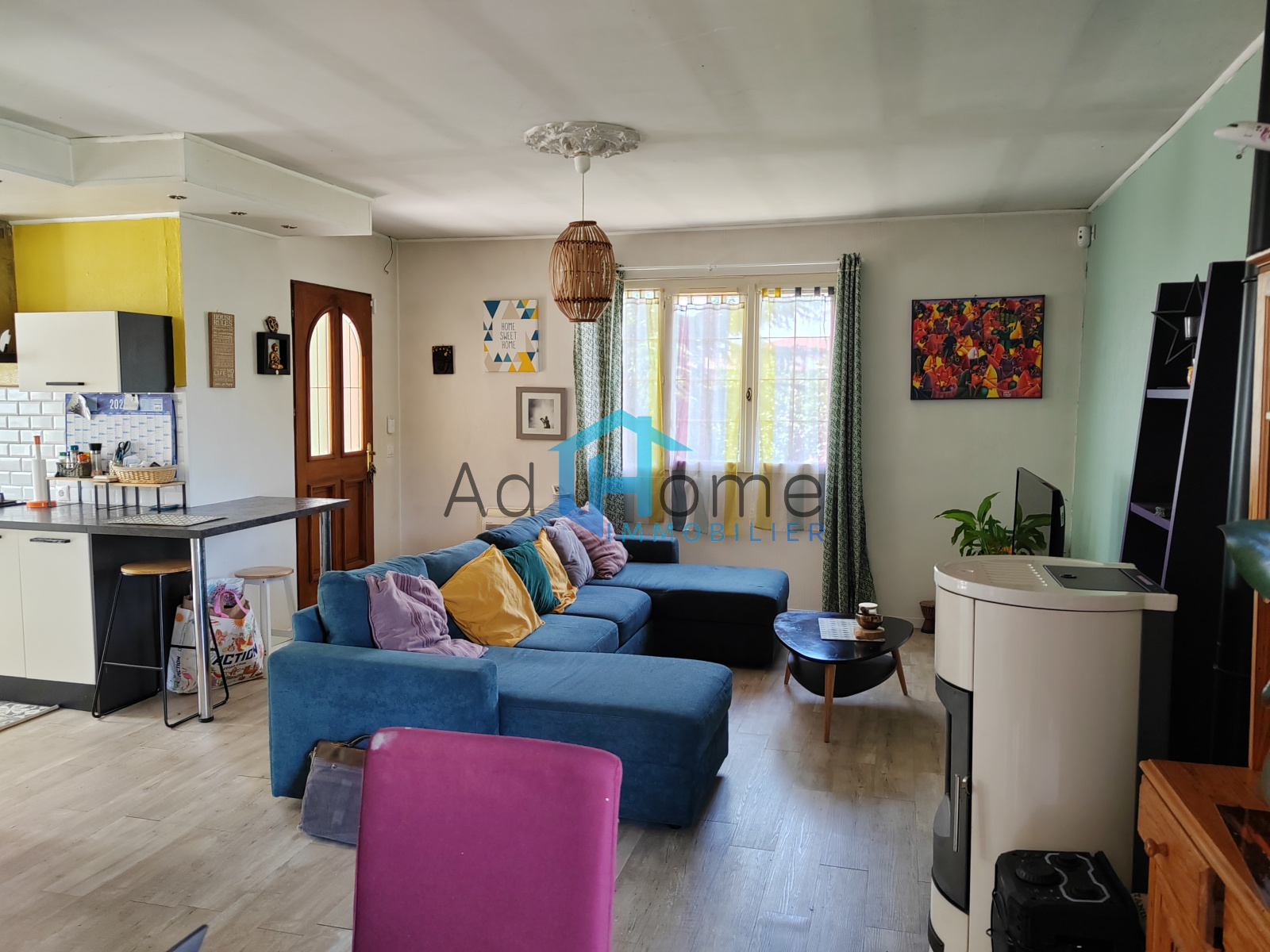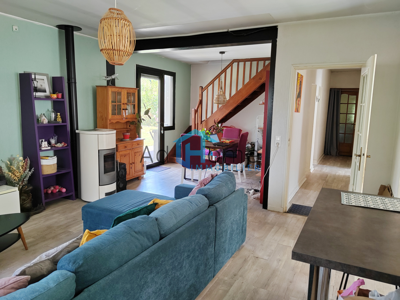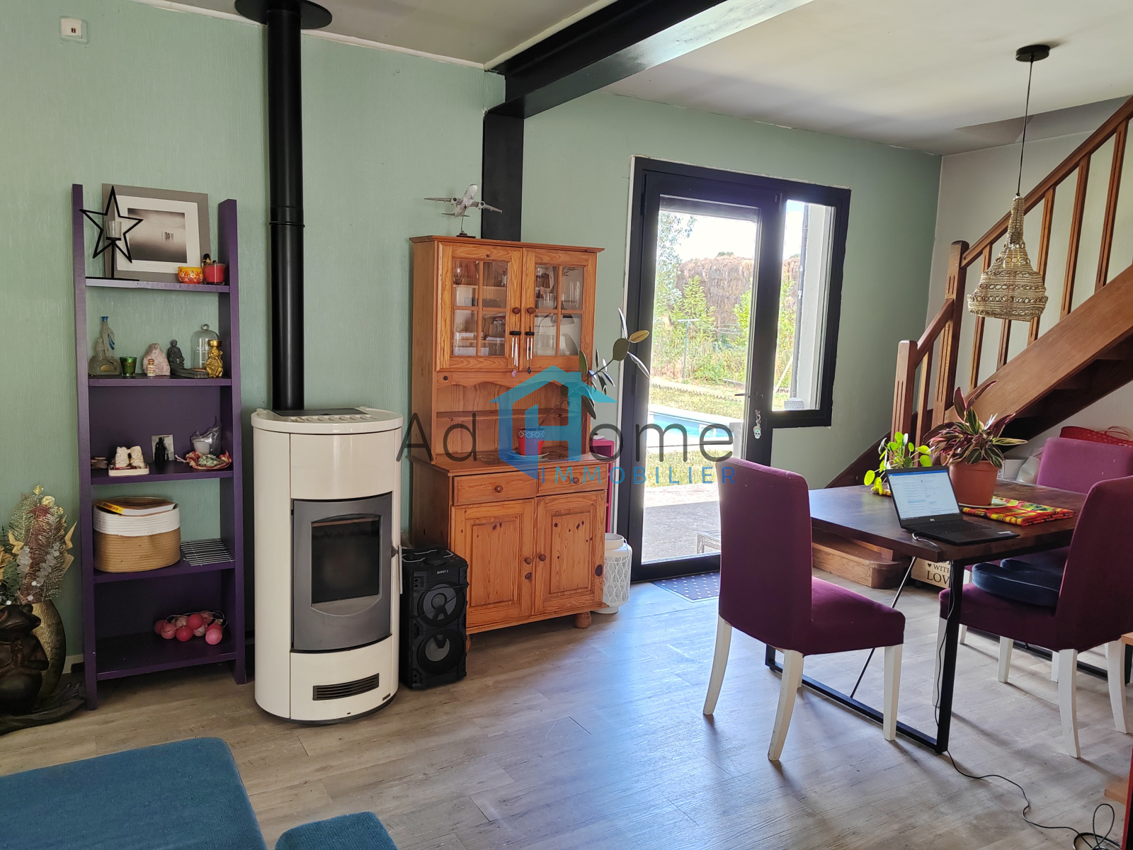 Le vaste séjour-salon de 32 m2 équipé d'un poele à granulé, propose une vue intimiste sur la terrasse, la piscine et le jardin arboré.
