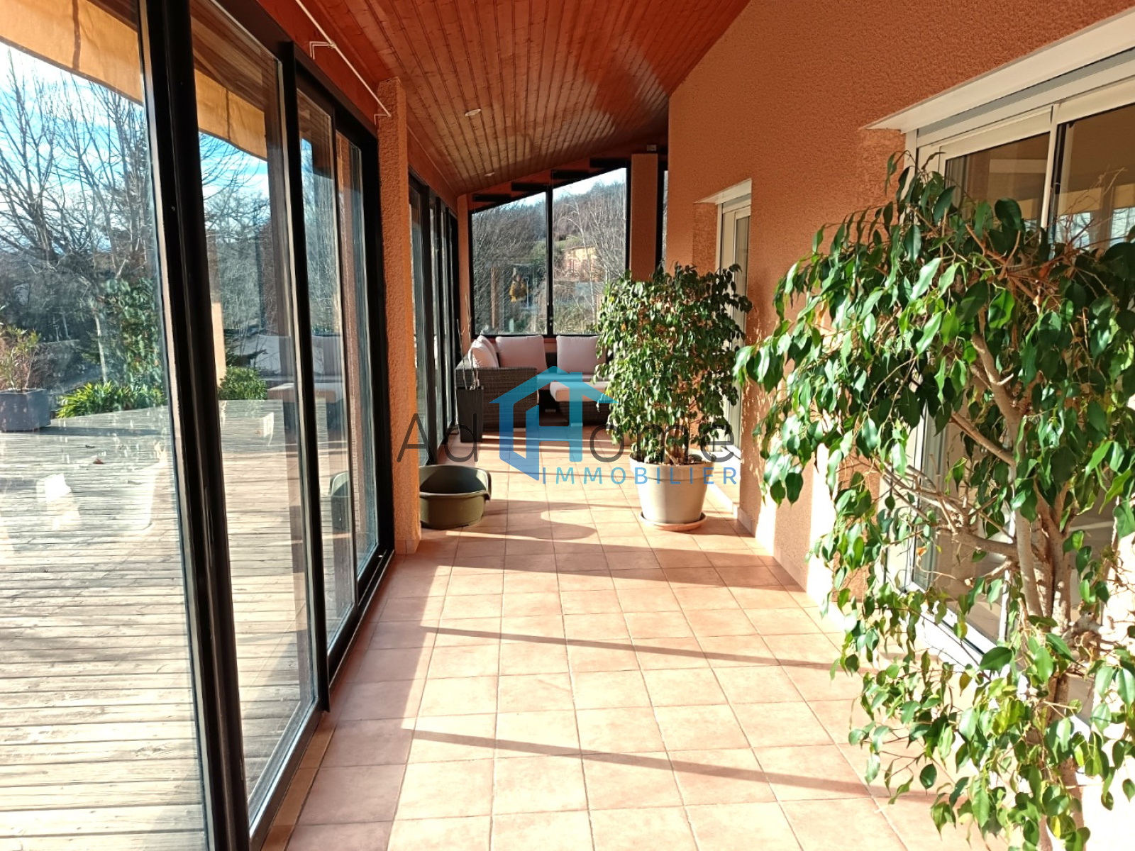 Dès l'entrée, vous découvrirez des espaces lumineux et accueillants, comprenant un salon avec plafond cathédrale et insert, ainsi qu'une salle à manger. Ces pièces se prolongent par une cuisine aménagée et équipée, avec un cellier/buanderie attenant. L'ensemble s'ouvre sur une vaste véranda de 50 m², elle-même prolongée par une grande terrasse en bois, parfaite pour profiter de la vue et des extérieurs.
