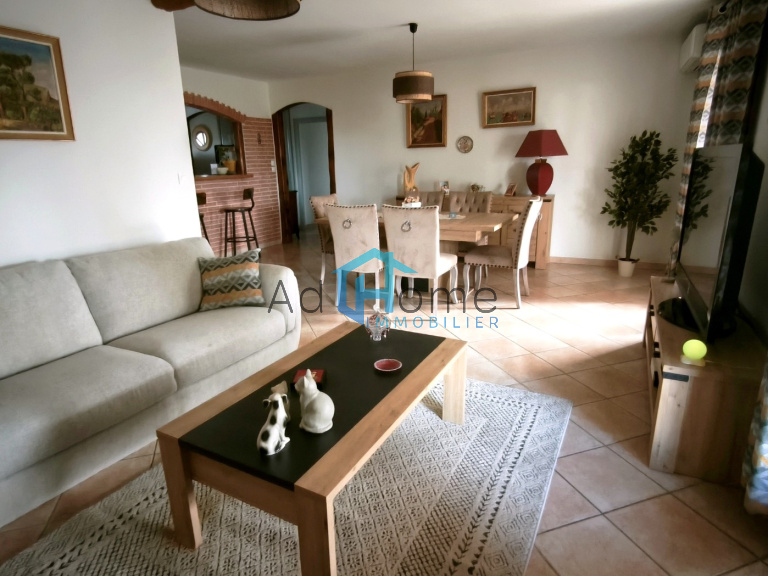 L’entrée avec placard dessert une cuisine semi-ouverte ainsi qu’un salon-salle à manger lumineux, ouvrant sur une grande terrasse couverte de plus de 30 m², avec vue sur la piscine et son pool house.